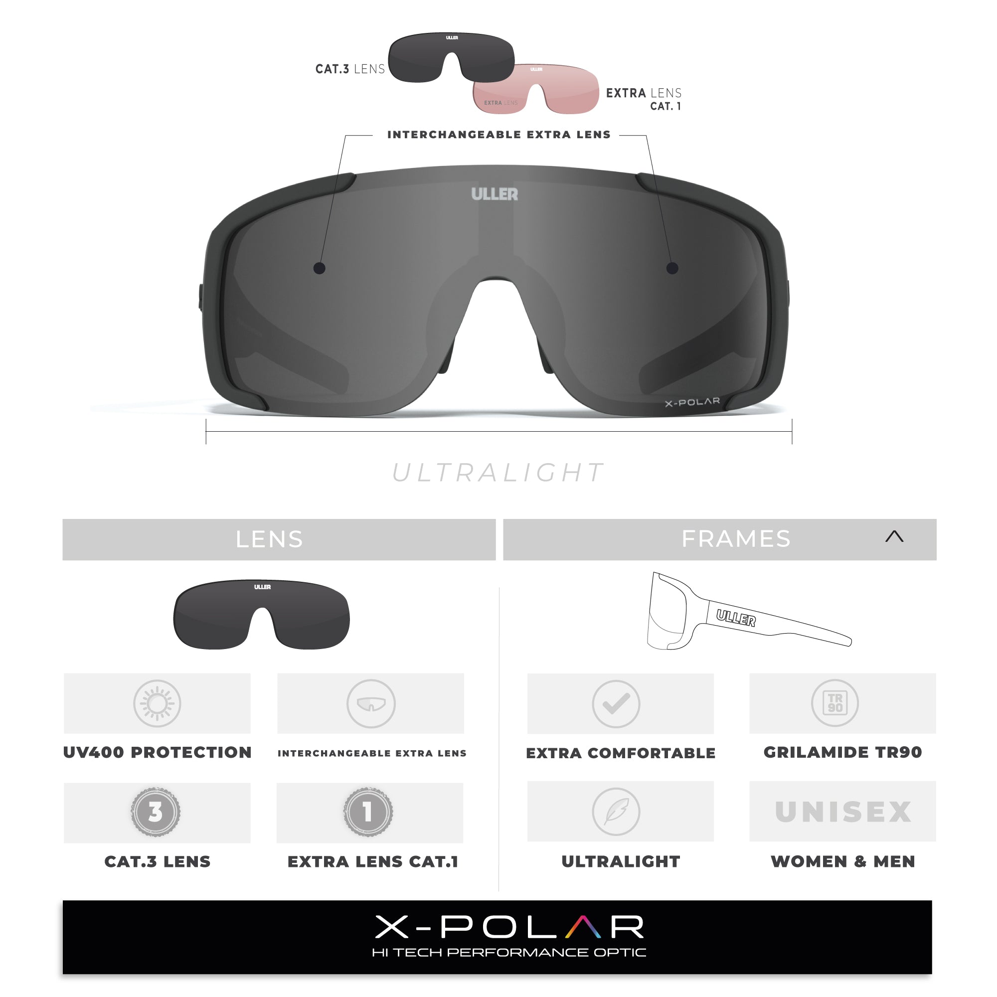 Toutes les lunettes de sport Uller® sont fabriqués avec les meilleurs matériaux du marché pour répondre aux exigences les plus élevées des athlètes d'élite et de haute performance. Ils sont également réglables grâce au petit cadre interne dont ils disposent, adapté à l'insertion de verres correcteurs.